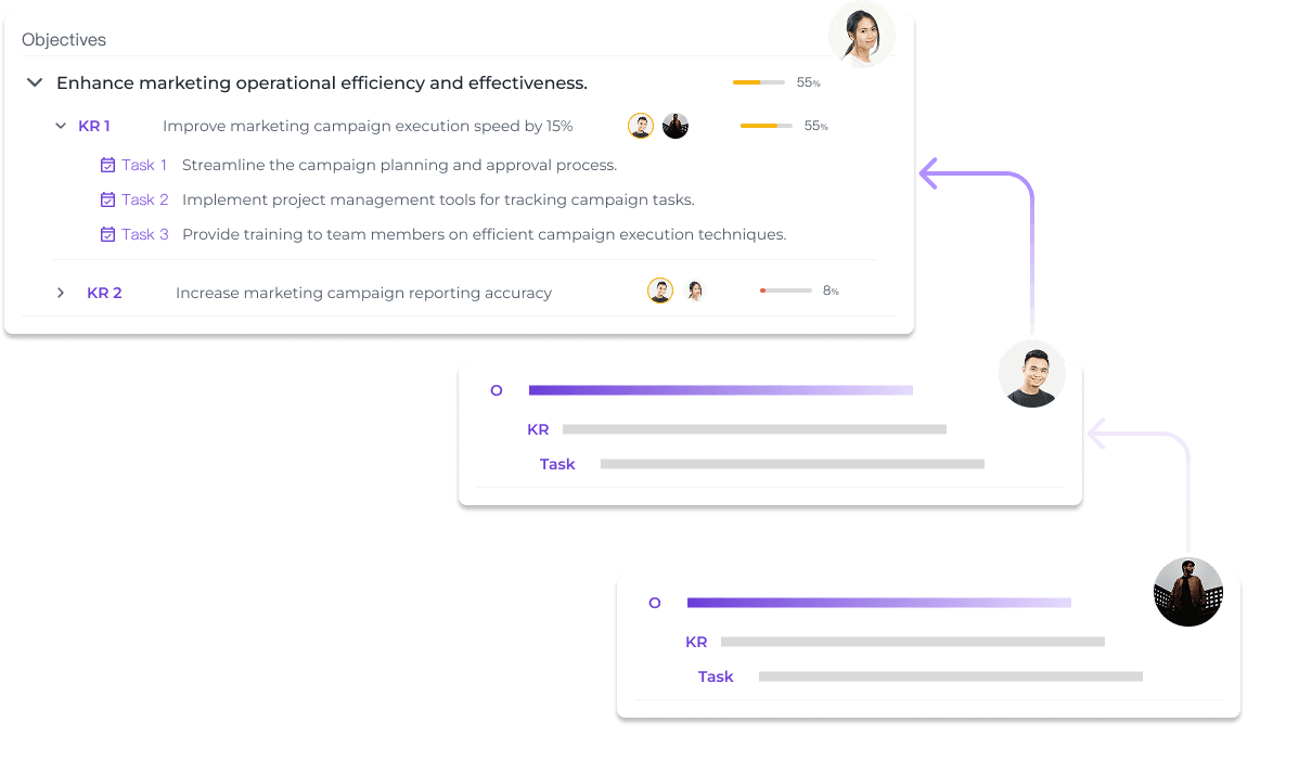 支持在复杂组织架构下灵活设定和分解OKR,帮助企业将战略目标层层传递到各业务单元和团队,实现从顶层到一线的高效对齐。